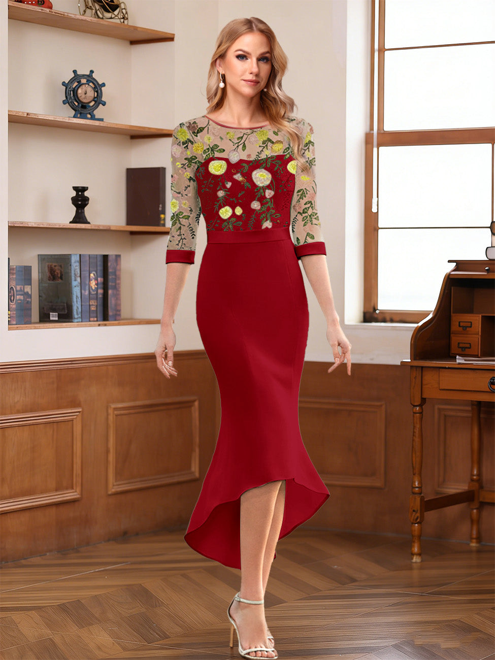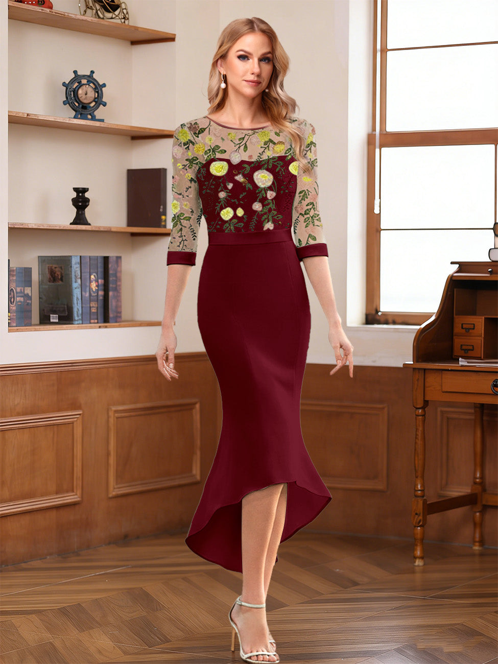 #Lottie 12011949 Sheath/Column Scoop Half Sleeves Tea-Length Mother of the Bride Dresses with Floral Appliques