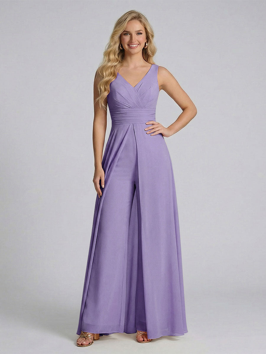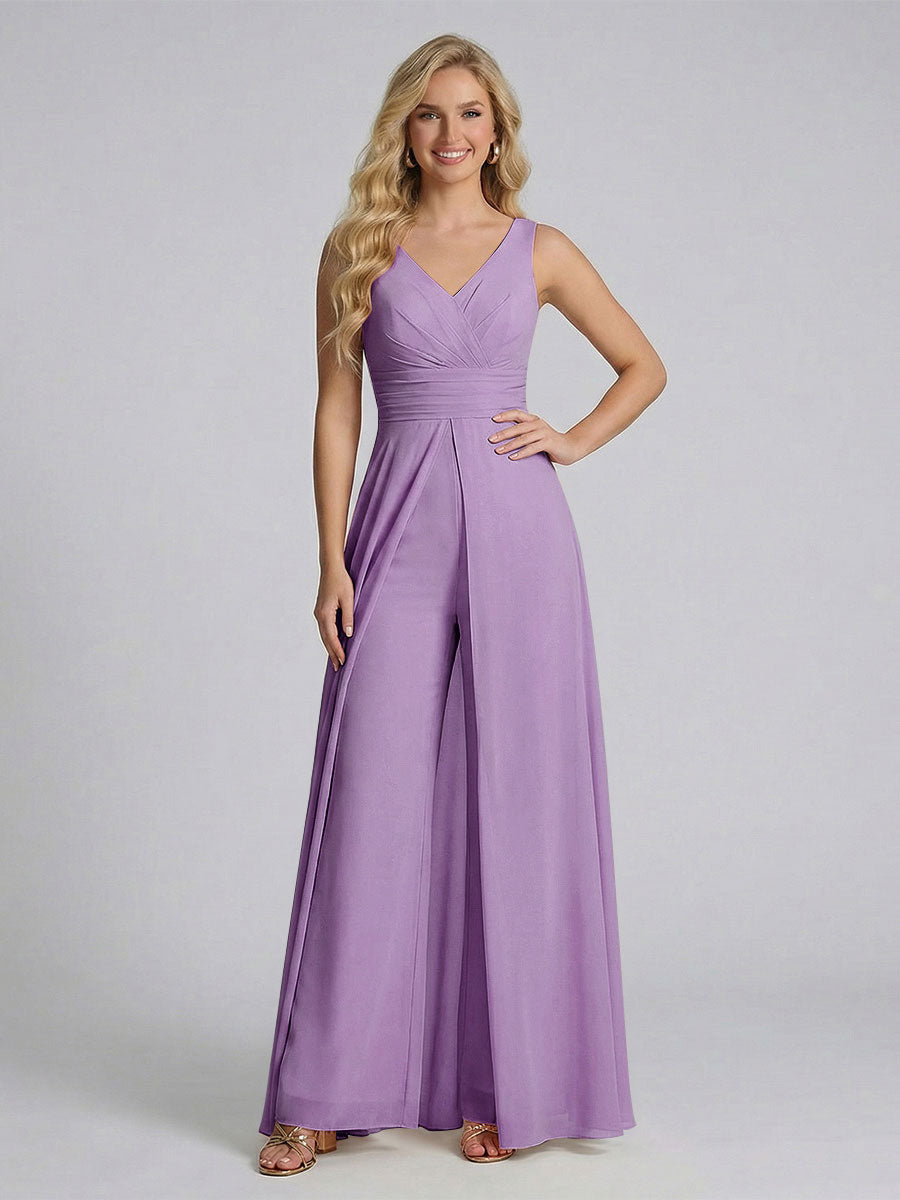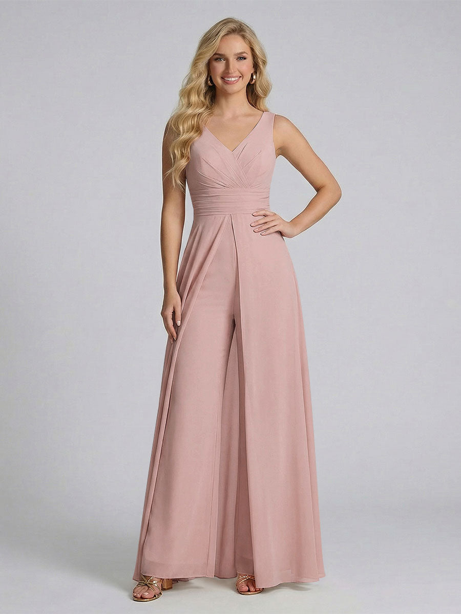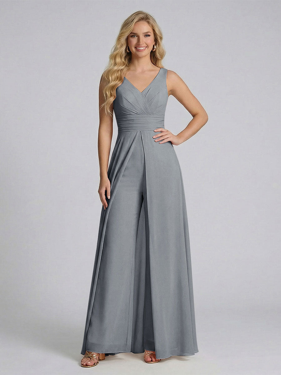#Ackermann 12011909 Jumpsuit V-Neck Sleeveless Chiffon Bridesmaid Dresses with Split Side