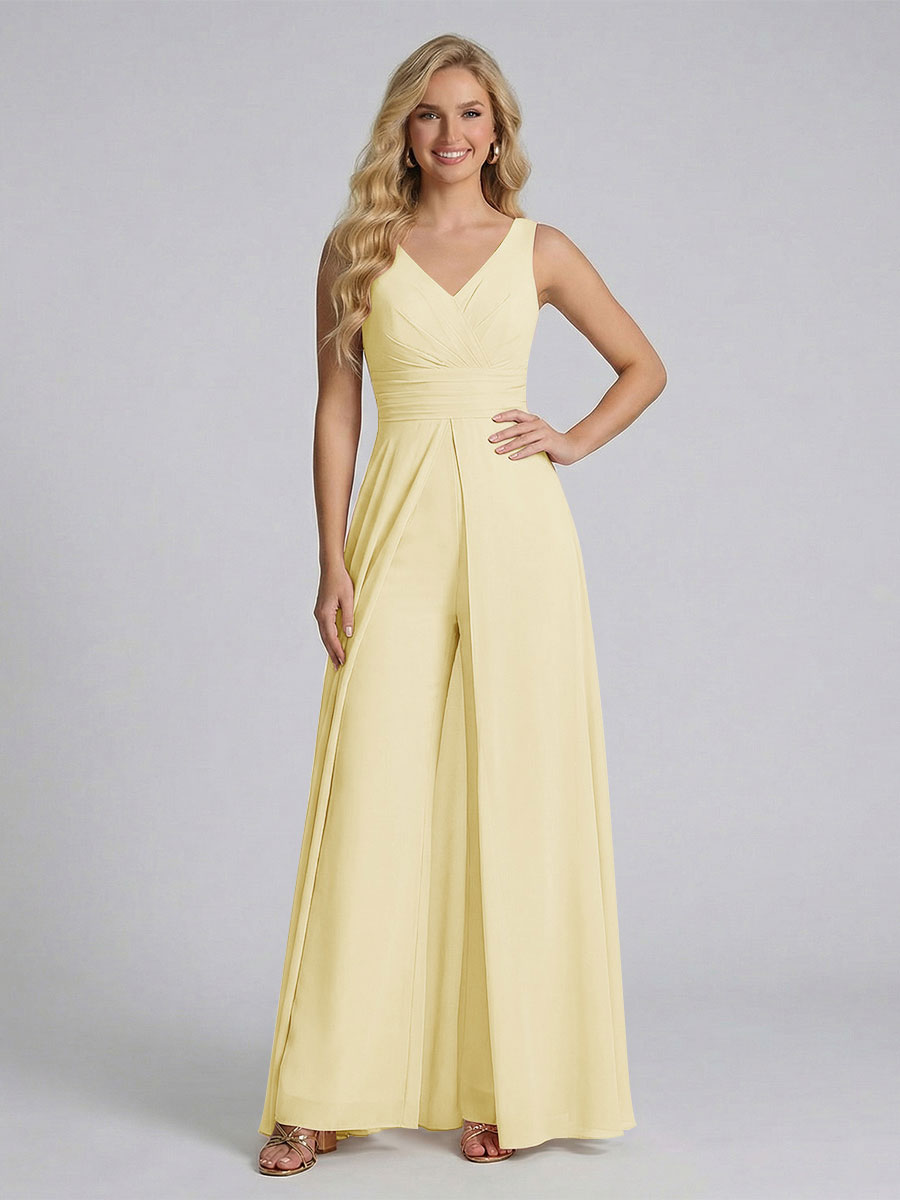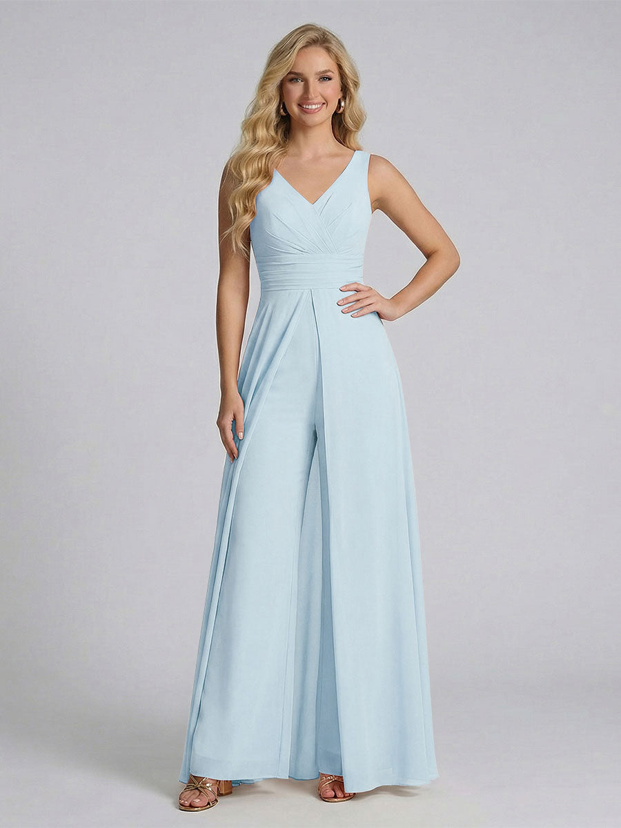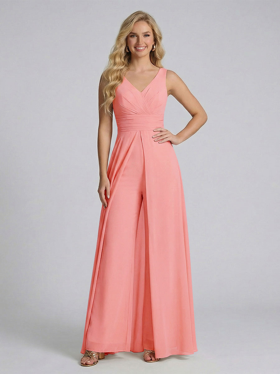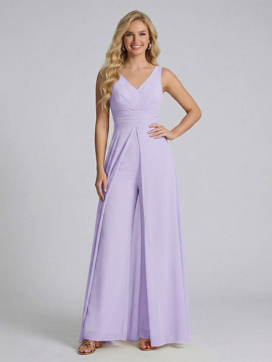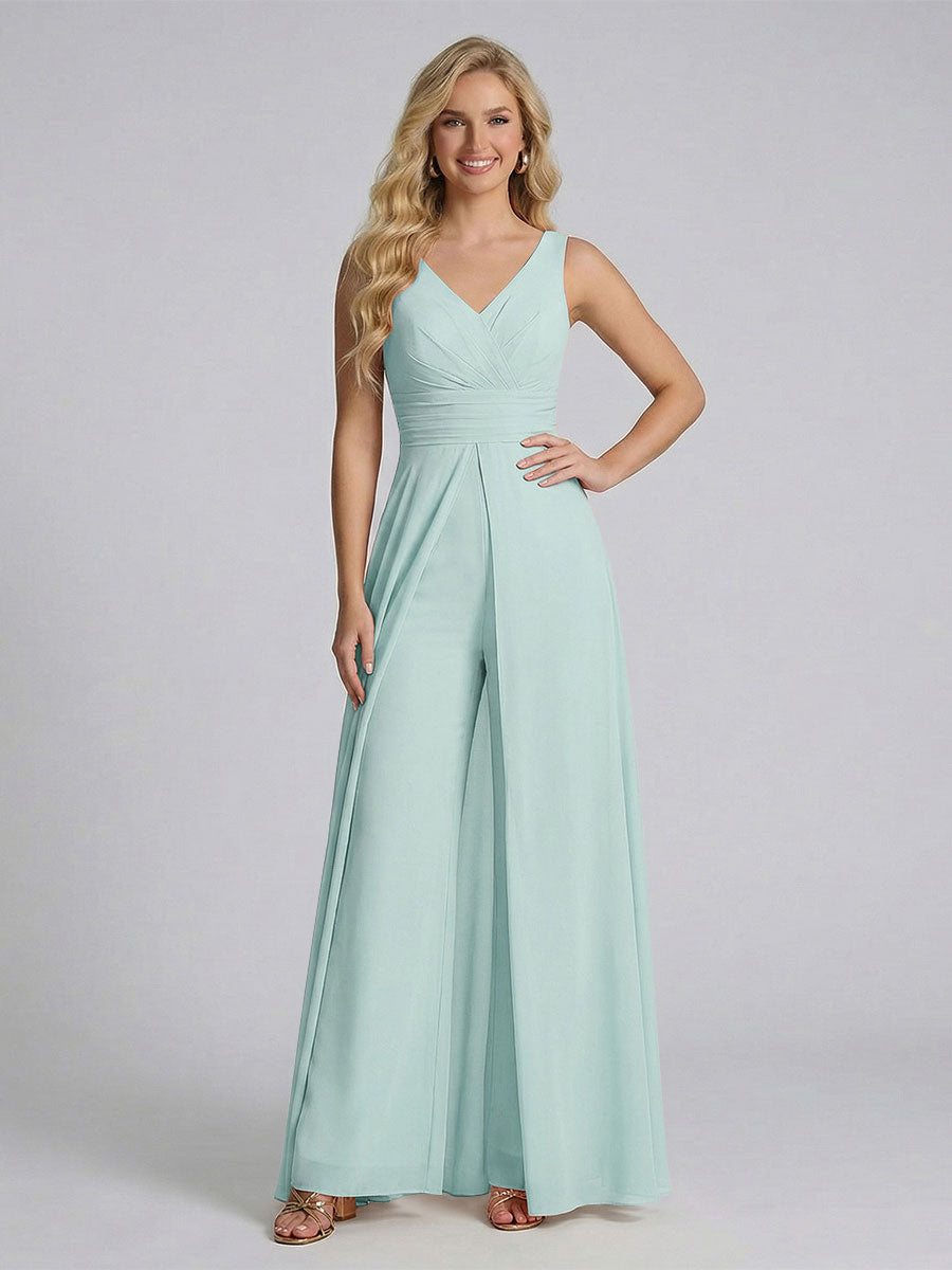#Ackermann 12011909 Jumpsuit V-Neck Sleeveless Chiffon Bridesmaid Dresses with Split Side