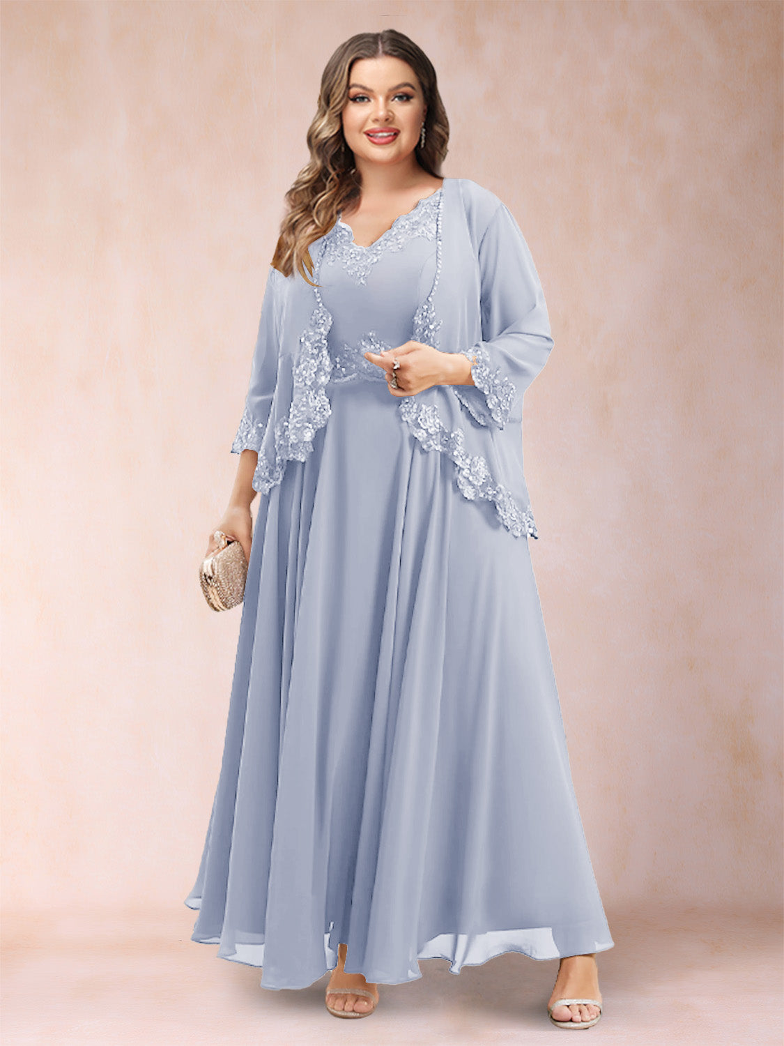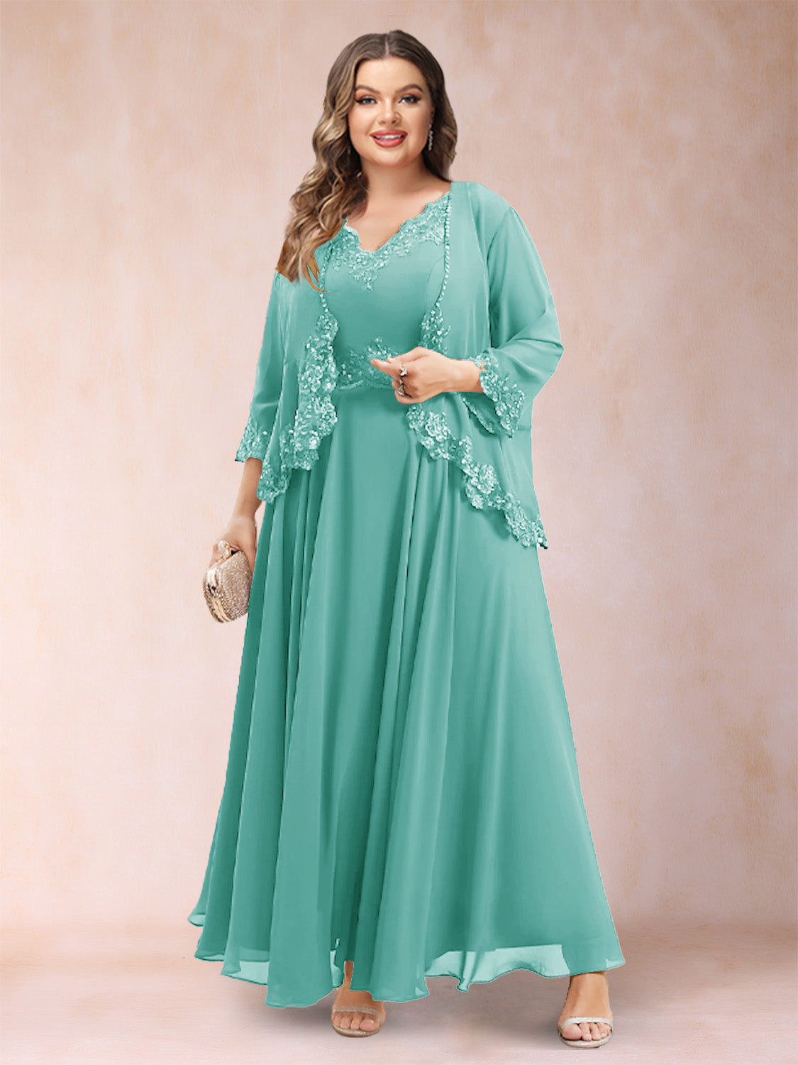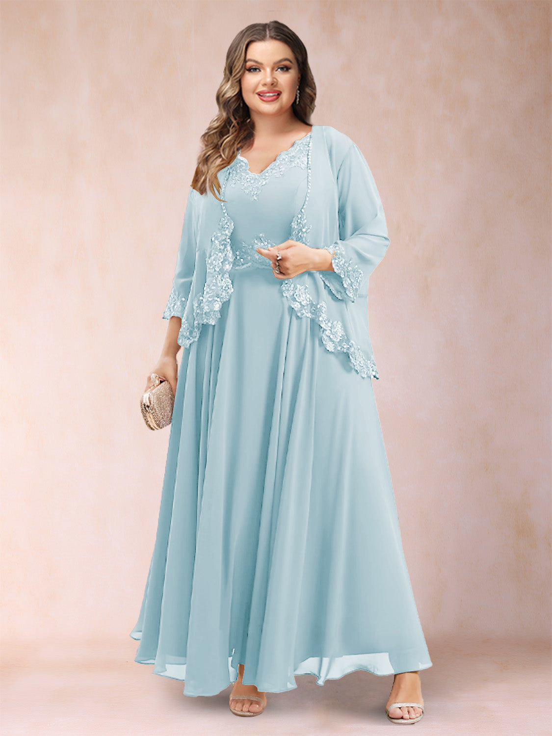 • A-Line/Princess V-Neck 3/4 Sleeves 2 Pieces Plus Size Mother of the Bride Dresses with Applique