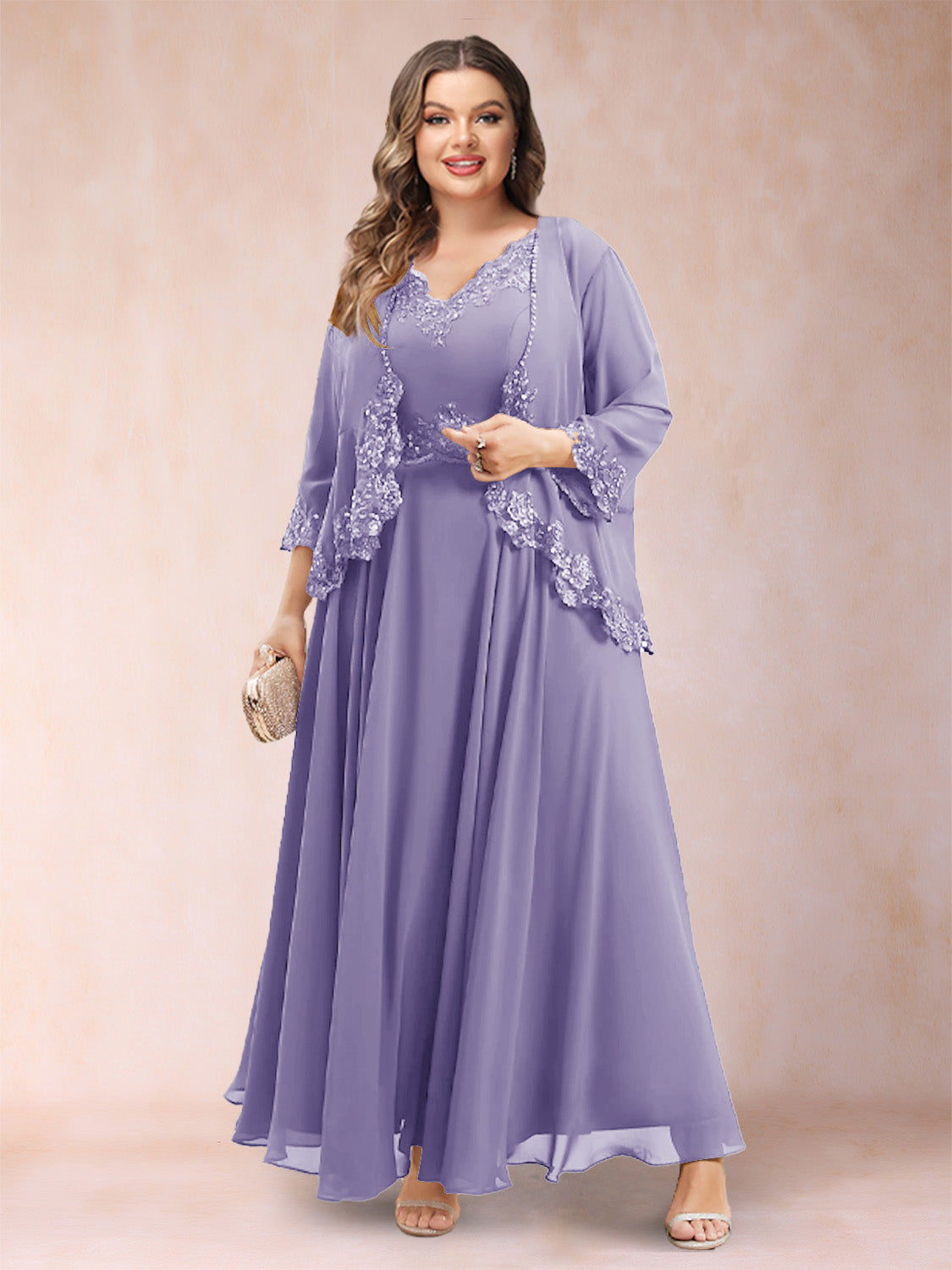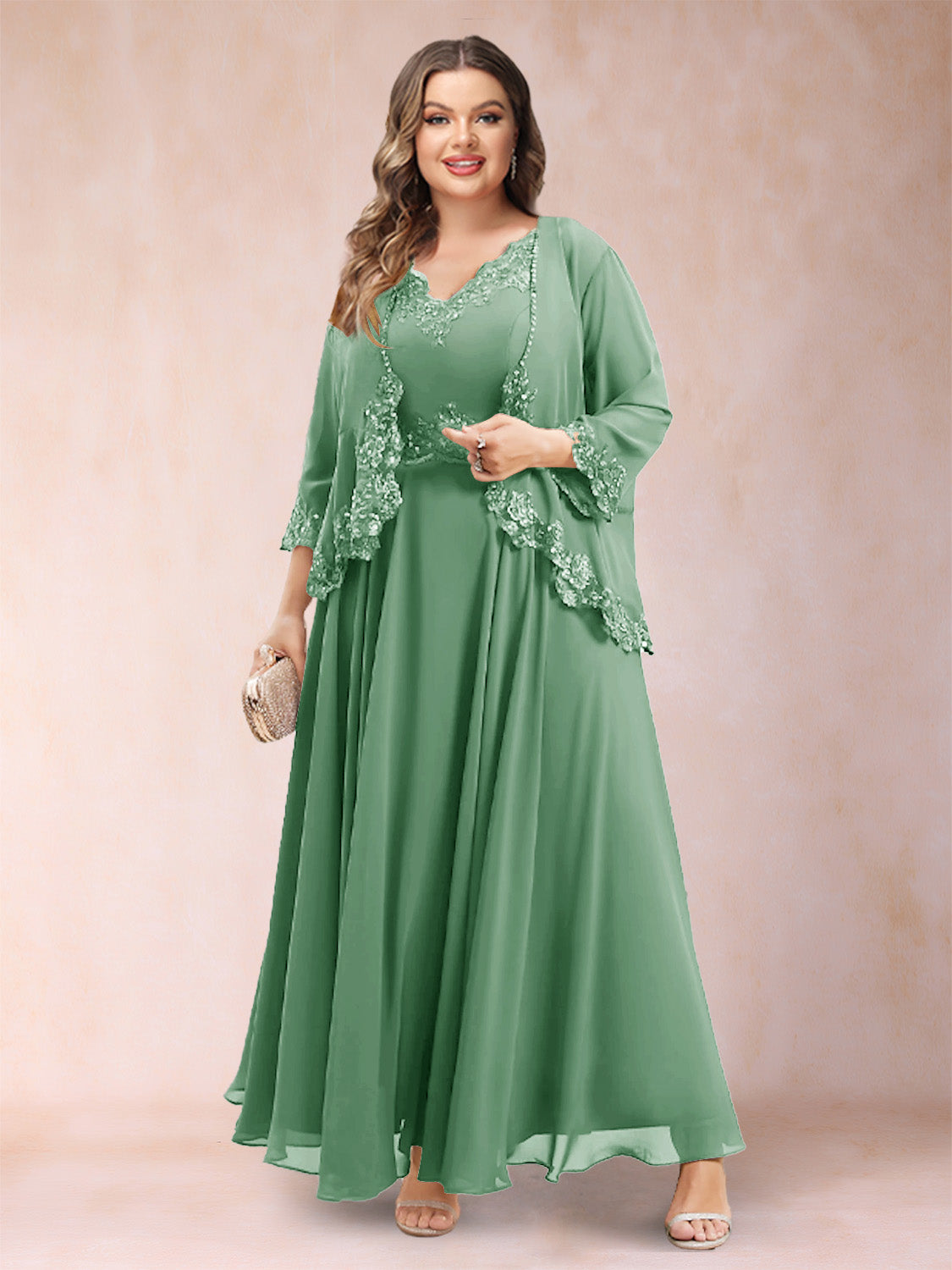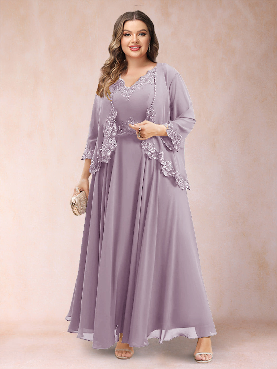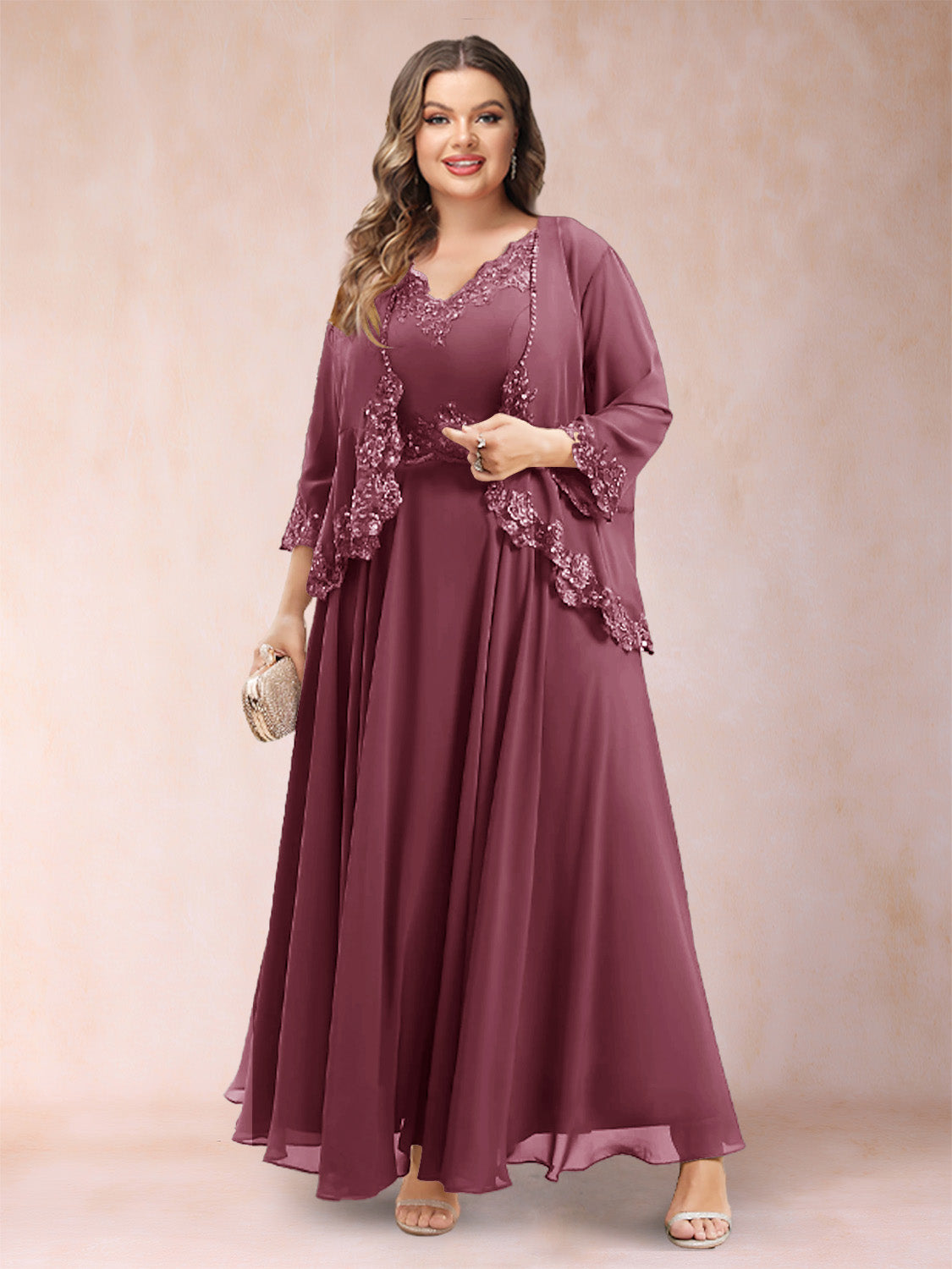 • A-Line/Princess V-Neck 3/4 Sleeves 2 Pieces Plus Size Mother of the Bride Dresses with Applique