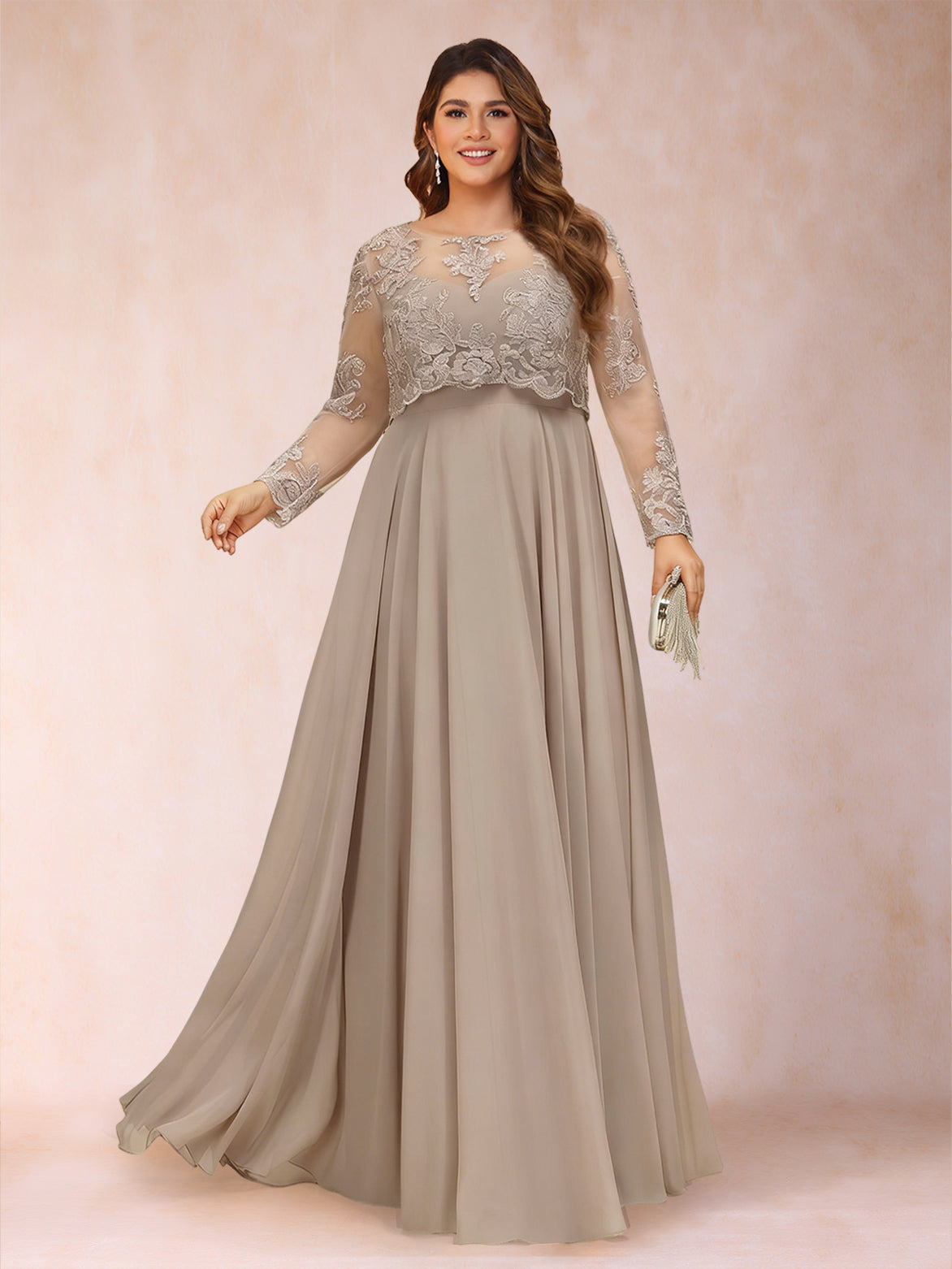 #Housman 12011739 Chiffon A-Line/Princess Illusion Crew Neck Long Sleeves Plus Size Mother of the Bride Dresses With Sequins & Appliques