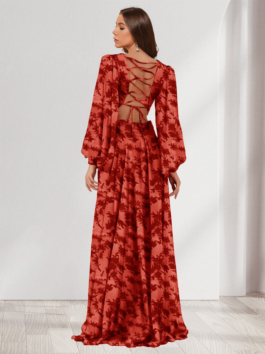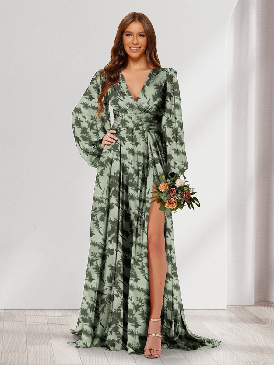 #Amos 99091093 A-Line/Princess V-Neck Long Sleeves Floor Length Bridesmaid Dresses with Split Side