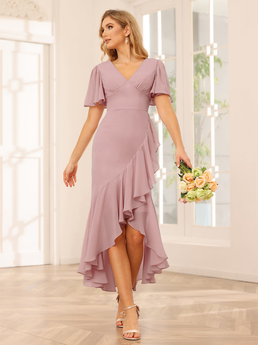 • Sheath/Column V-Neck Asymmetrical Bridesmaid Dresses with Ruffles