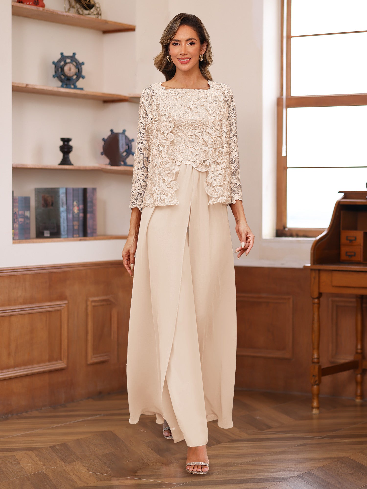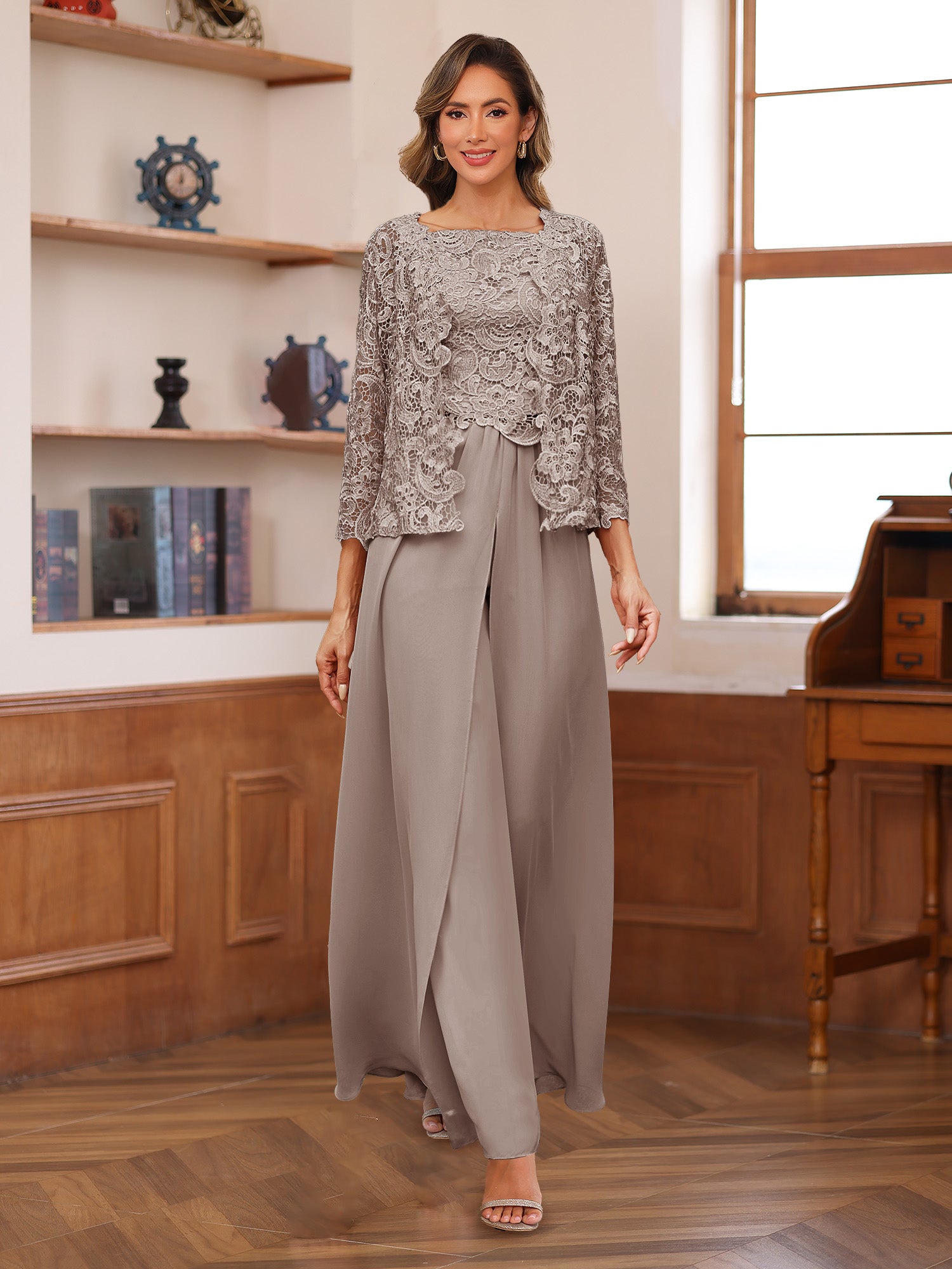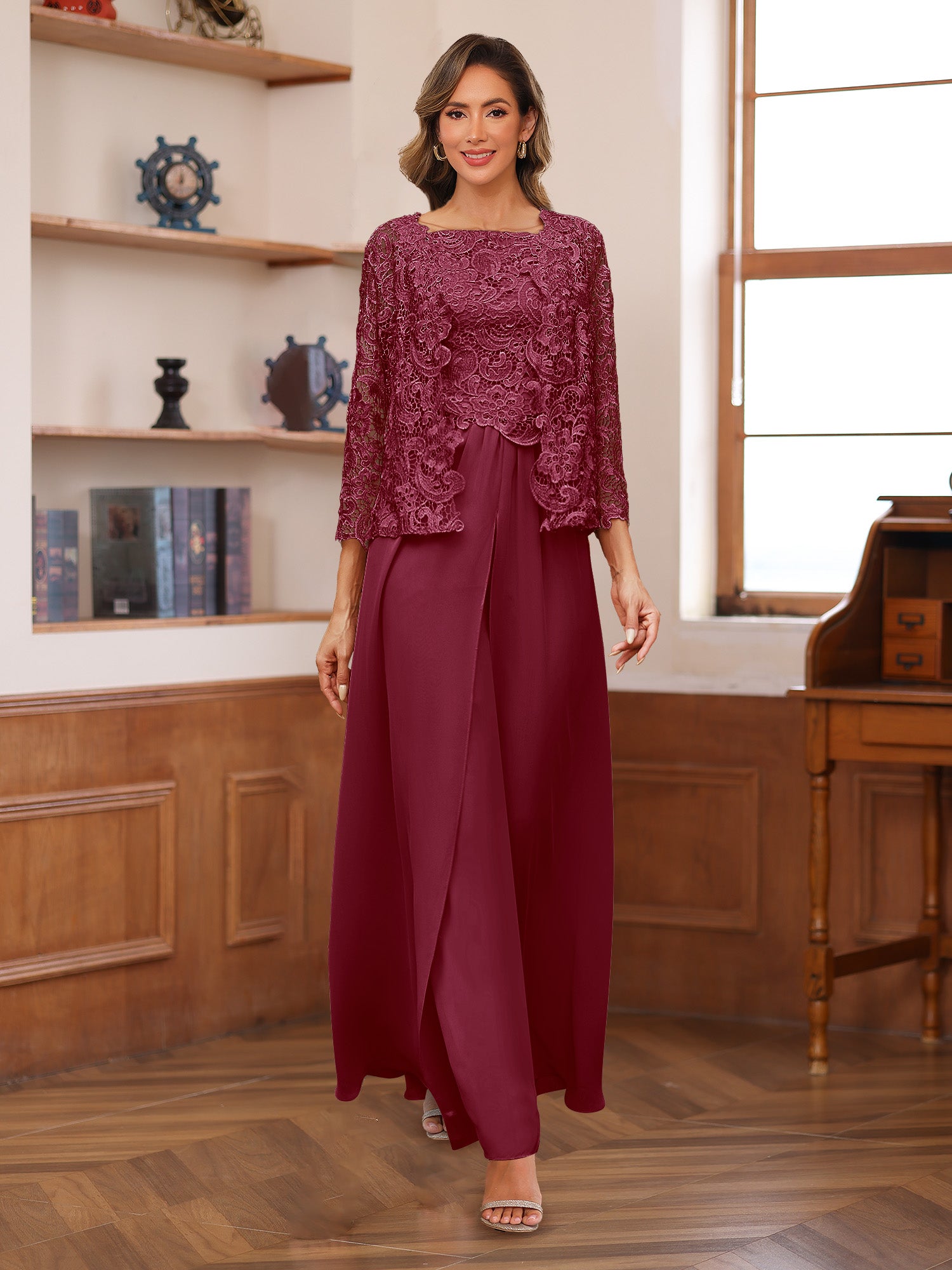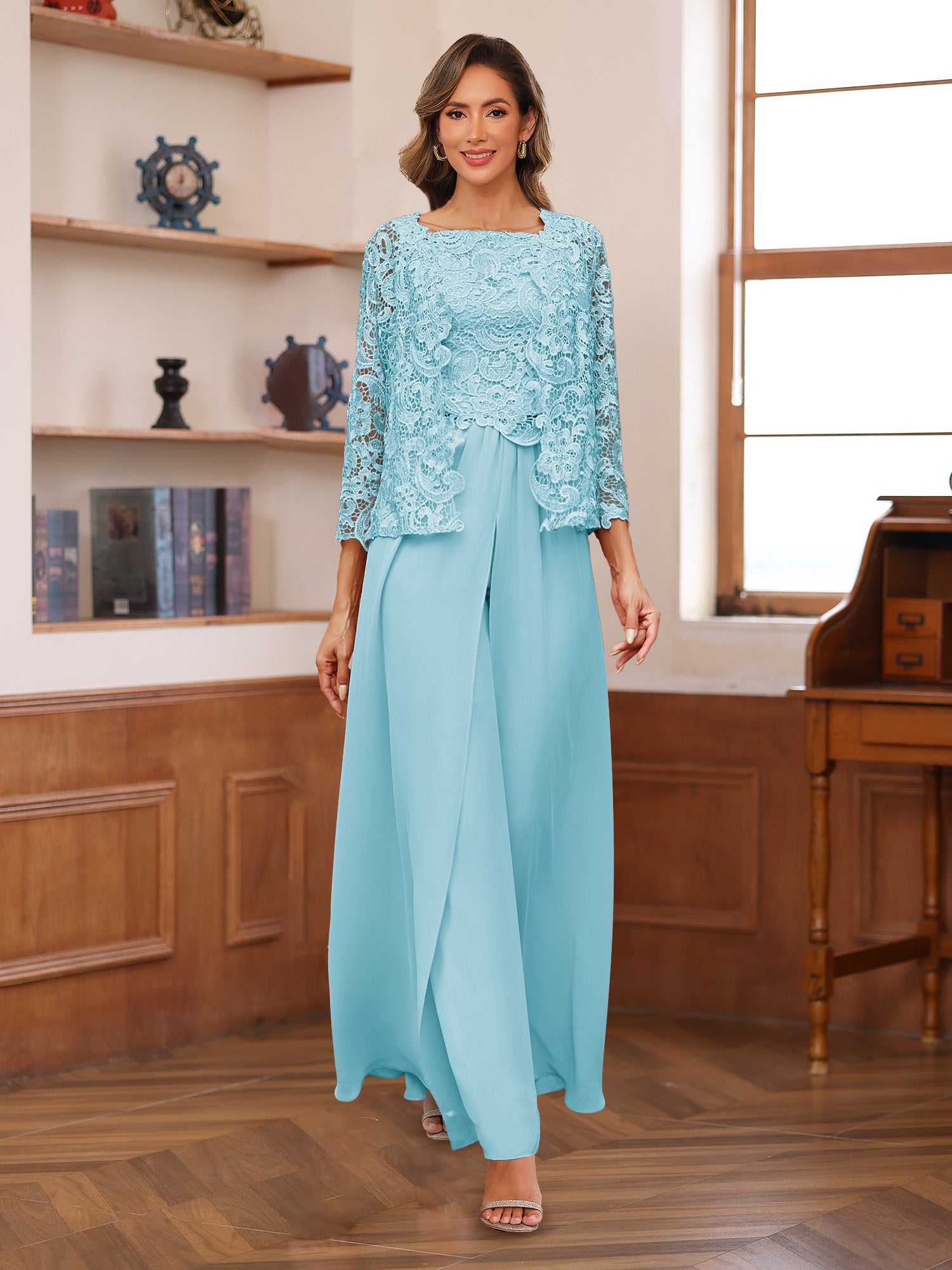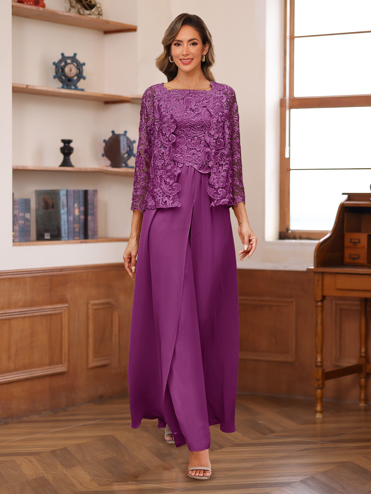 #Kara 22441666 Lace Chiffon Square Neck 3/4 Sleeves 3 Pieces Pantsuits with Appliques & Jacket