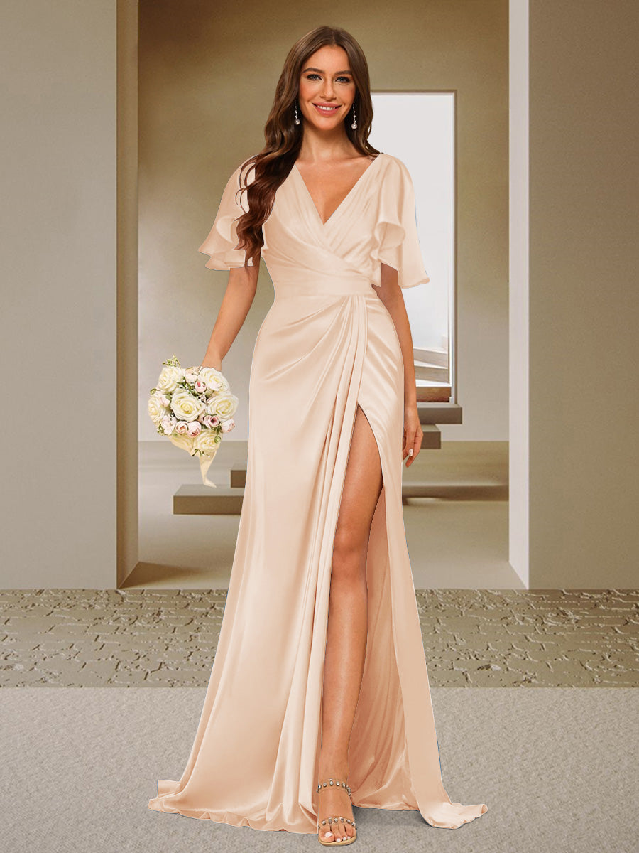 • Trumpet/Mermaid V-Neck Short Sleeves Ruched Bridesmaid Dresses with Split Side & Ruffles