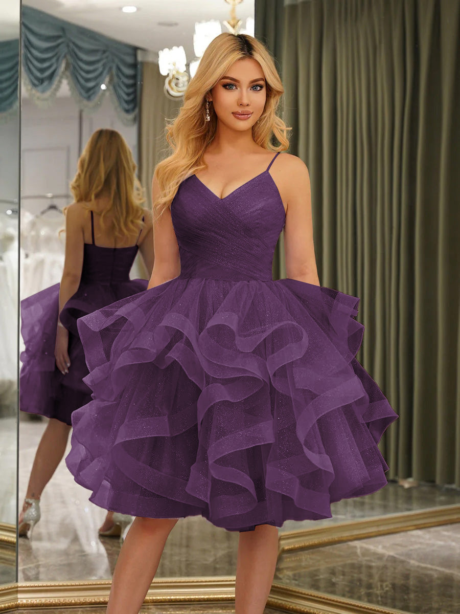 • Spaghetti Straps Sleeveless Knee-Length Ball Gown Dresses with Ruffles