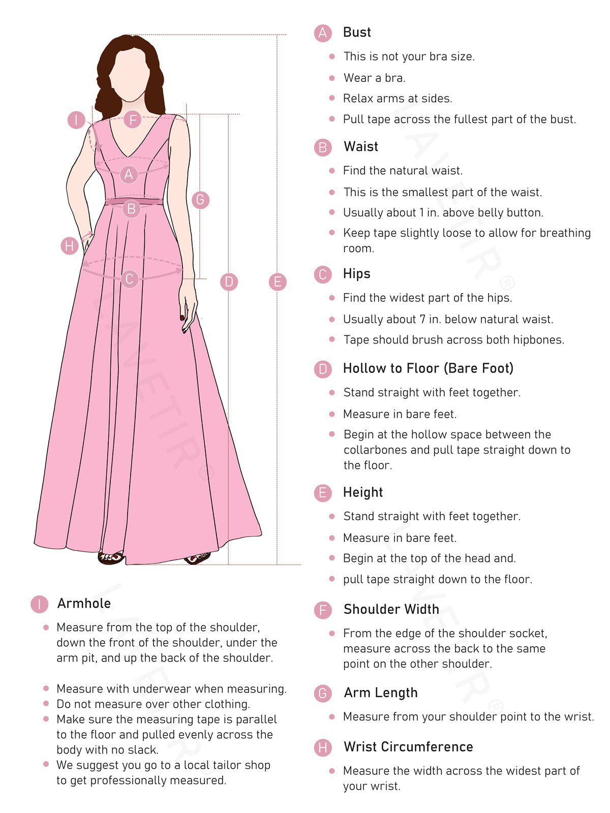 • To fit high heels, we’ll add an extra 1-5 cm onto customized floor-length dresses and dresses with trains.