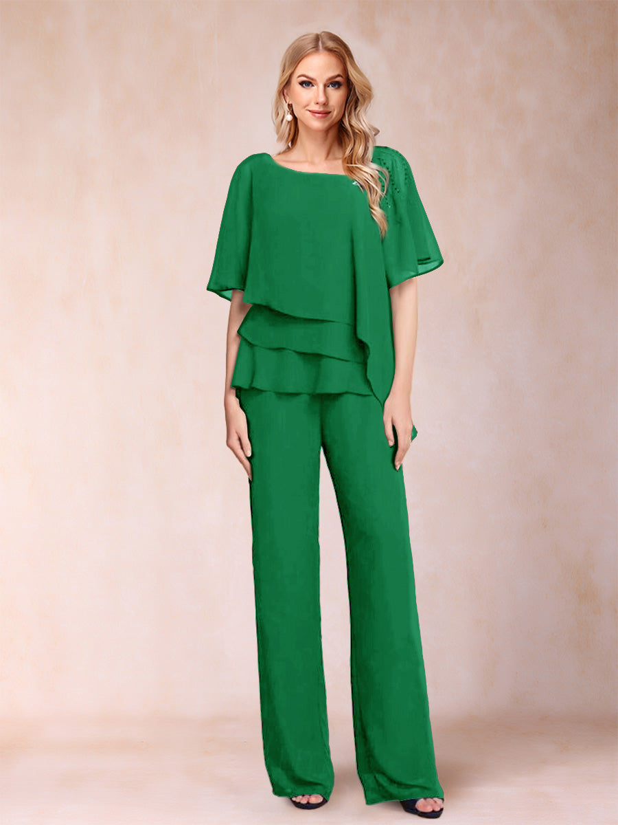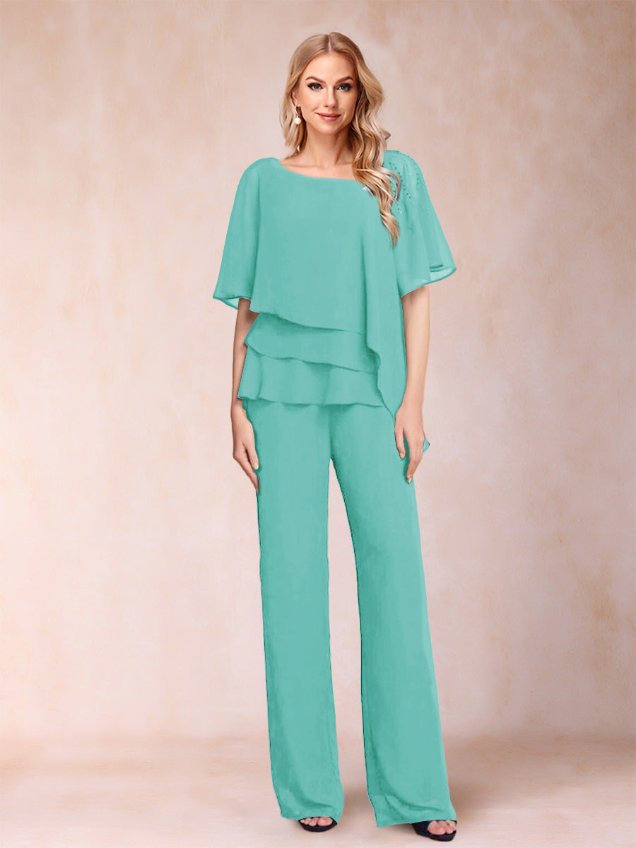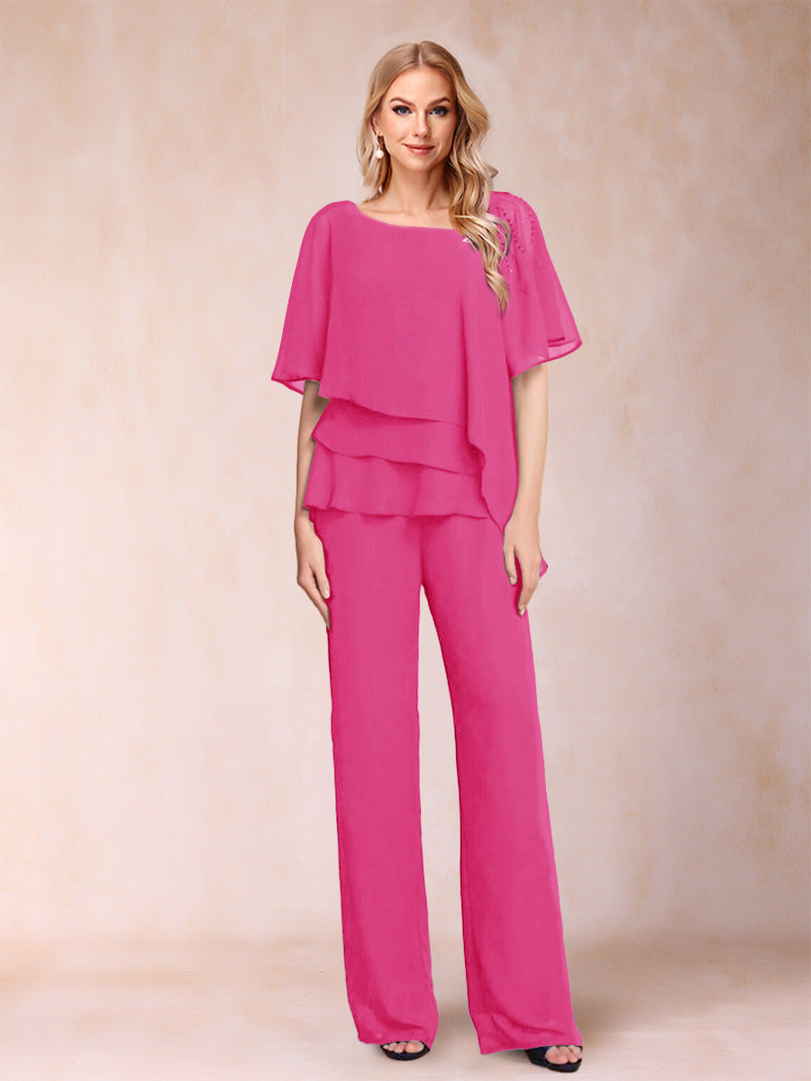 • Chiffon V-Neck Half Sleeves 2 Pieces Pantsuits with Rhinestone