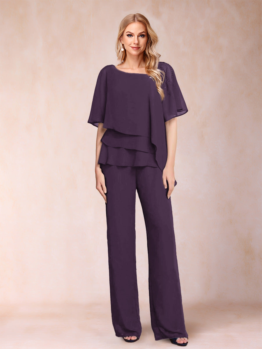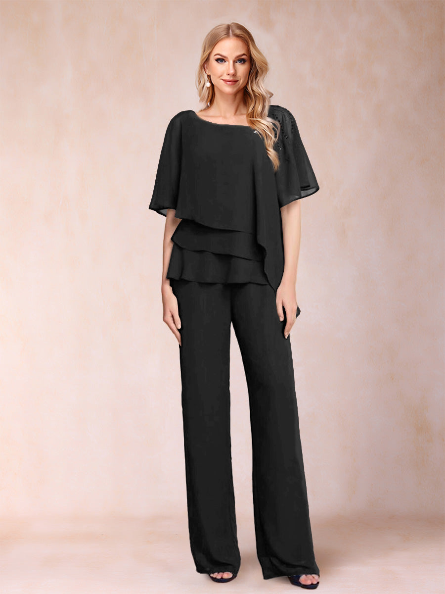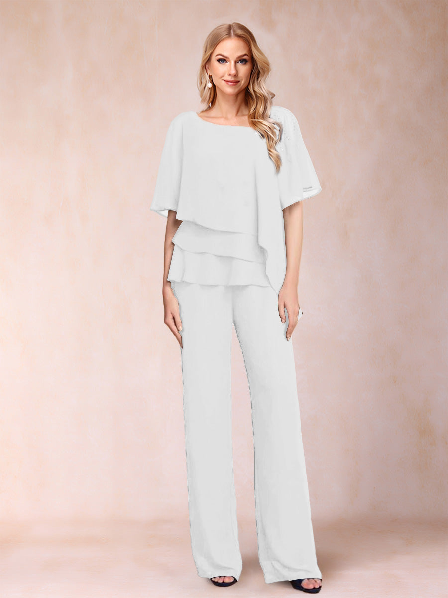 • Chiffon V-Neck Half Sleeves 2 Pieces Pantsuits with Rhinestone