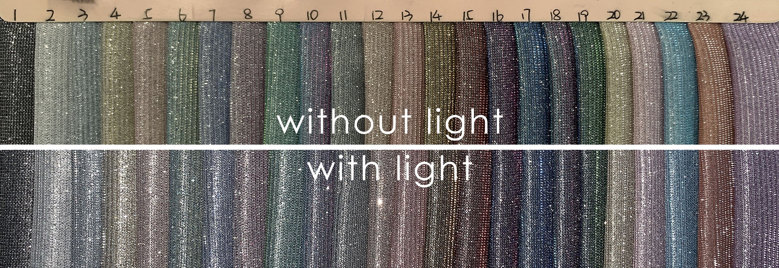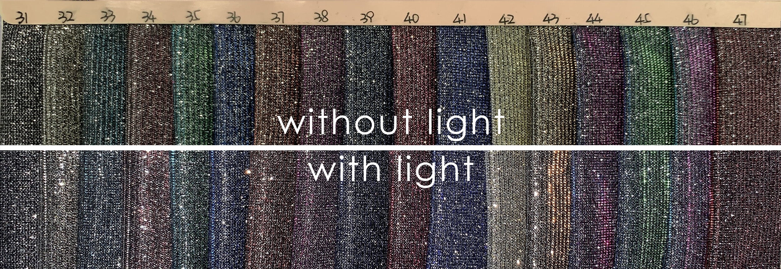 Metallic Lurex is a very special fabric which is shining and sparkling. The color may vary in different light condition. So when you choose color, please compare the fabric in light and with bright light.